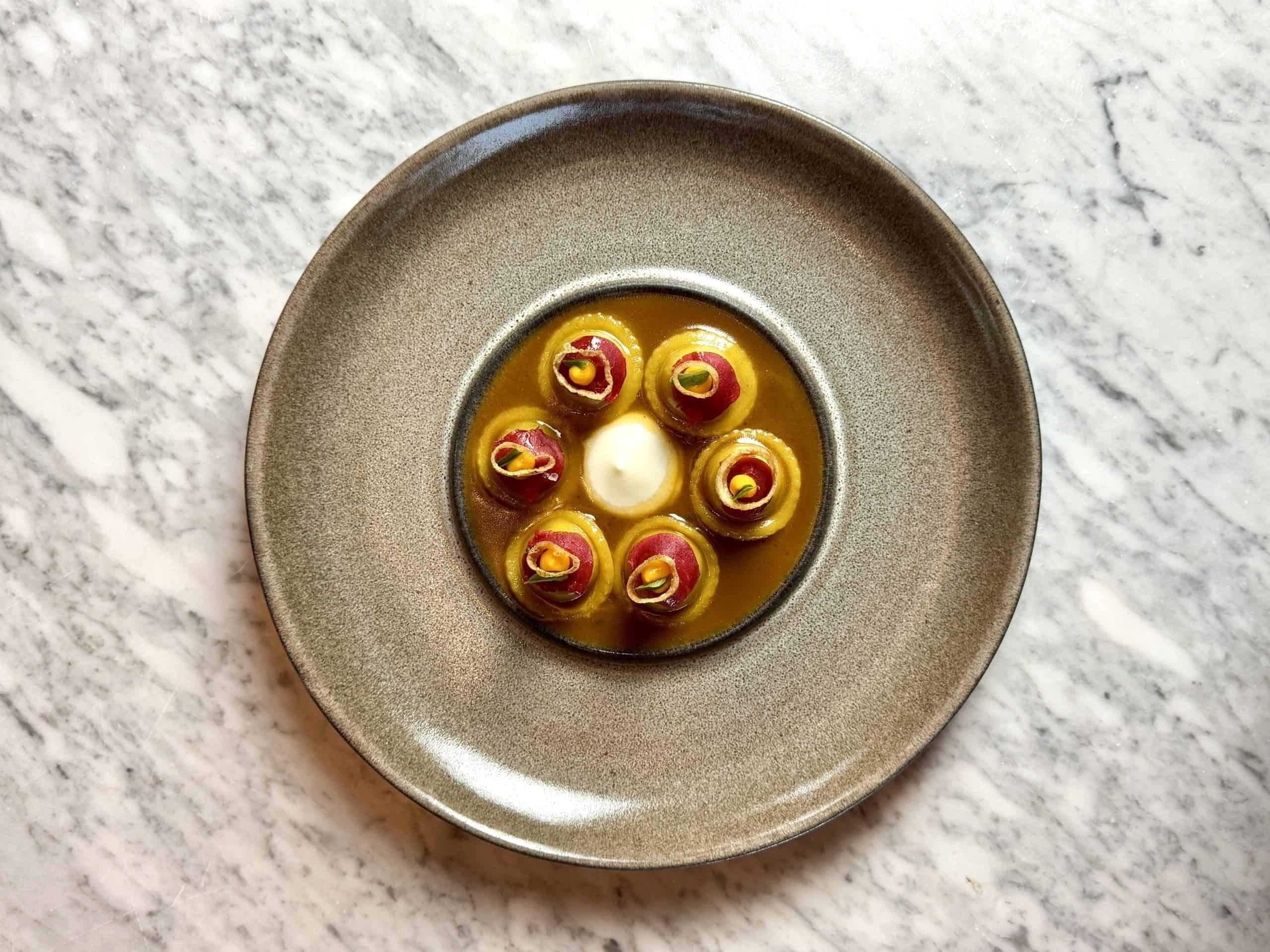 La cuisine s’appuie sur une philosophie claire : respecter le produit, en révéler l’essence et raconter une histoire lisible, sans détours. Les ingrédients proviennent majoritairement de producteurs locaux, sélectionnés pour la qualité de leur travail et leur connaissance intime de la terre. Les saisons guident naturellement les assiettes, inspirant une cuisine italienne contemporaine, précise et ancrée, qui valorise légumes, herbes, céréales et viandes du territoire avec justesse. Le geste est mesuré, le goût net, l’intention toujours lisible, portée par une équipe qui cuisine autant avec technique qu’avec curiosité.